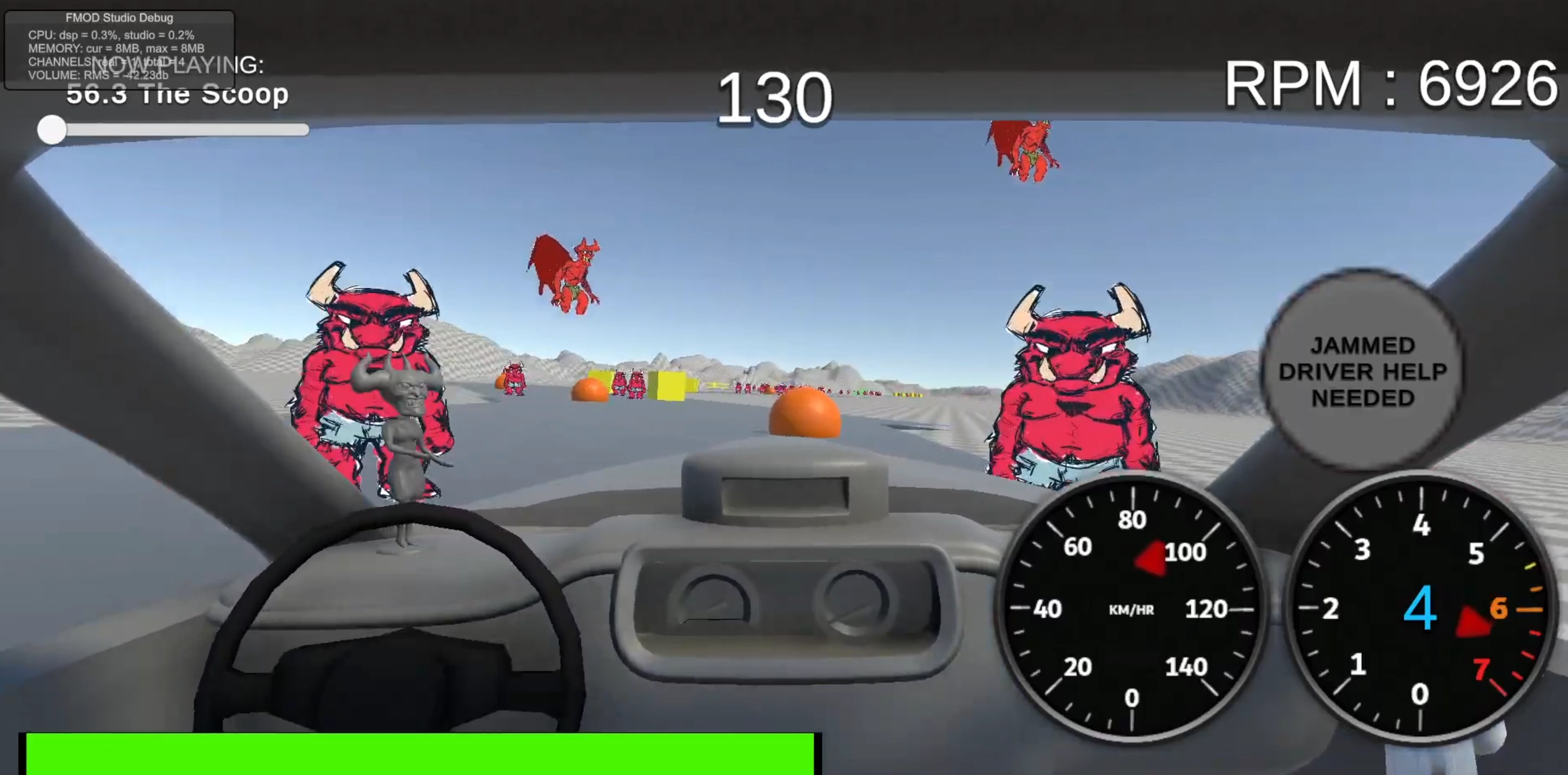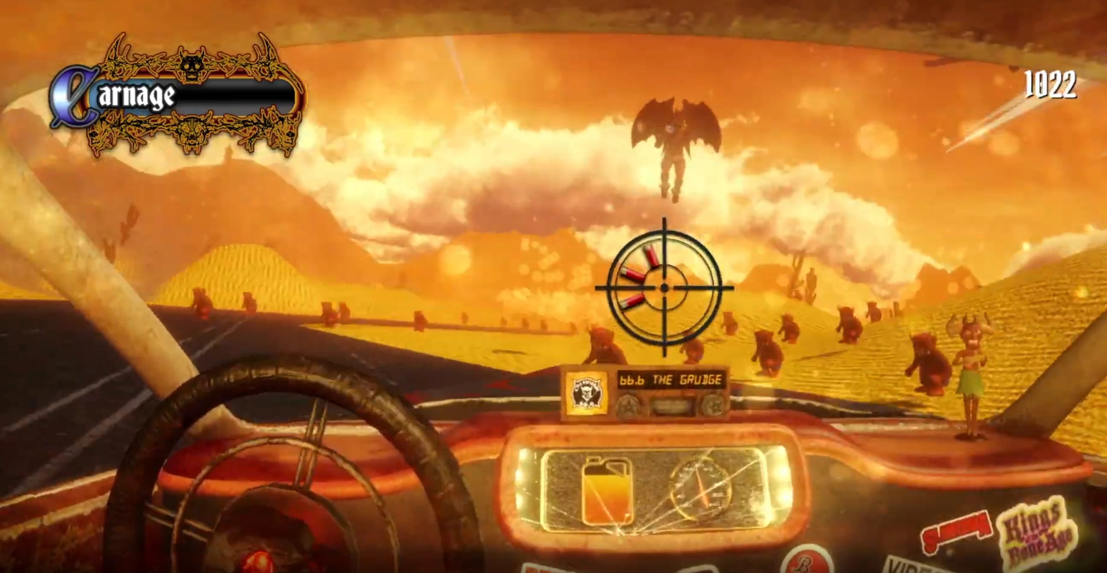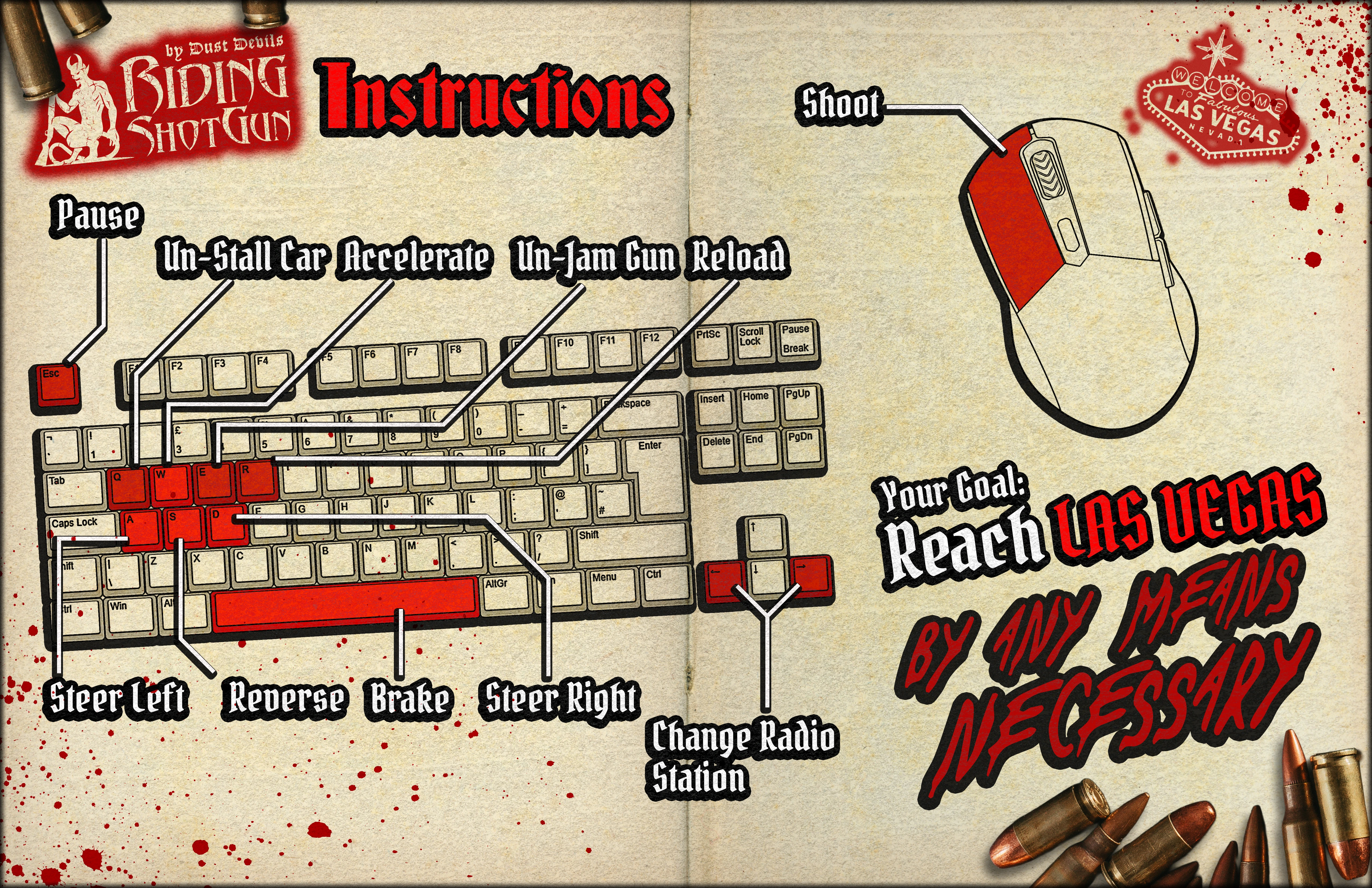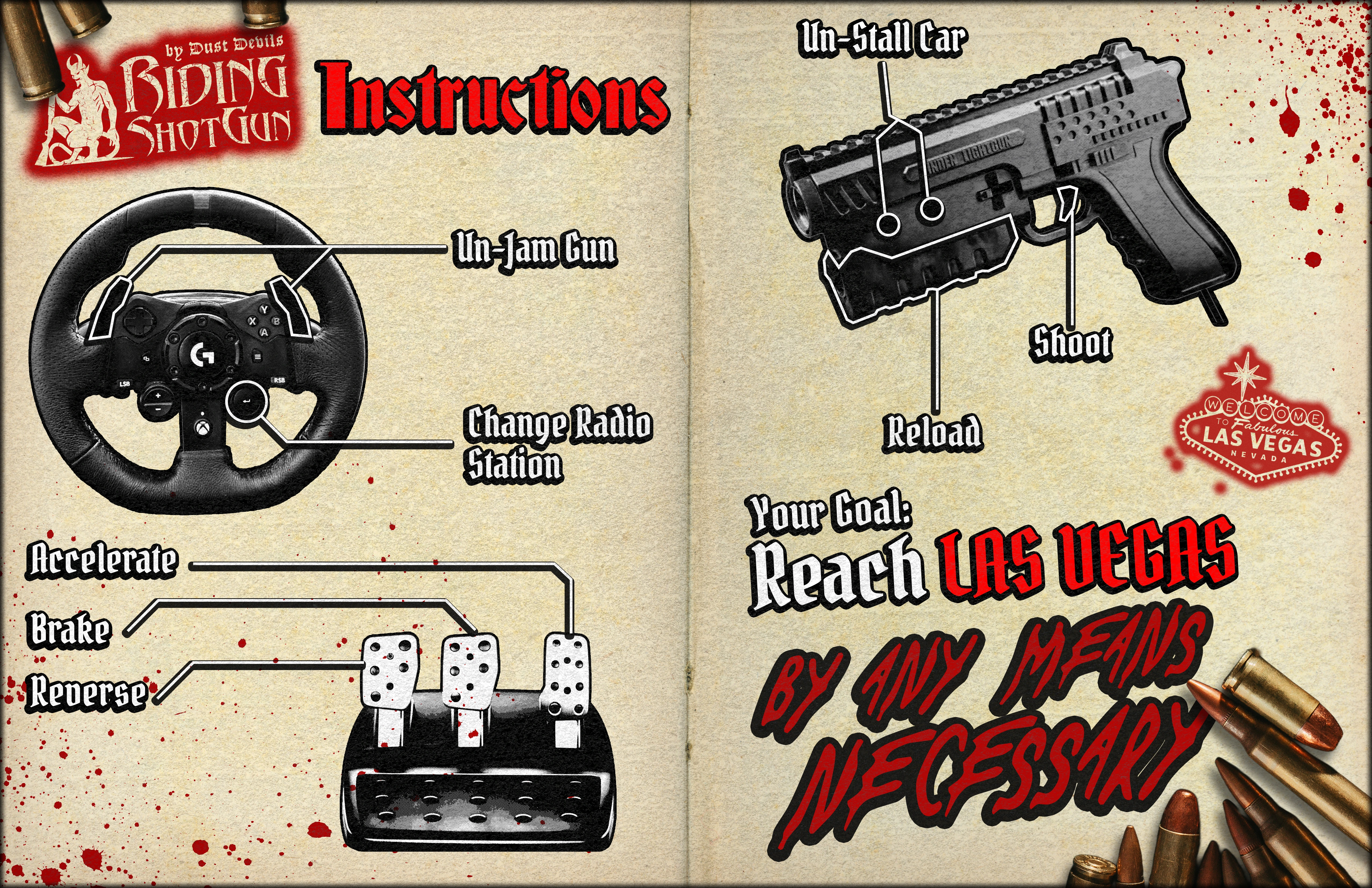 Riding Shotgun is a hectic co-op arcade game. Where one player drives and the other shoots, players must survive an onslaught of demons in the Mojave Desert to reach the sinful city of Las Vegas.